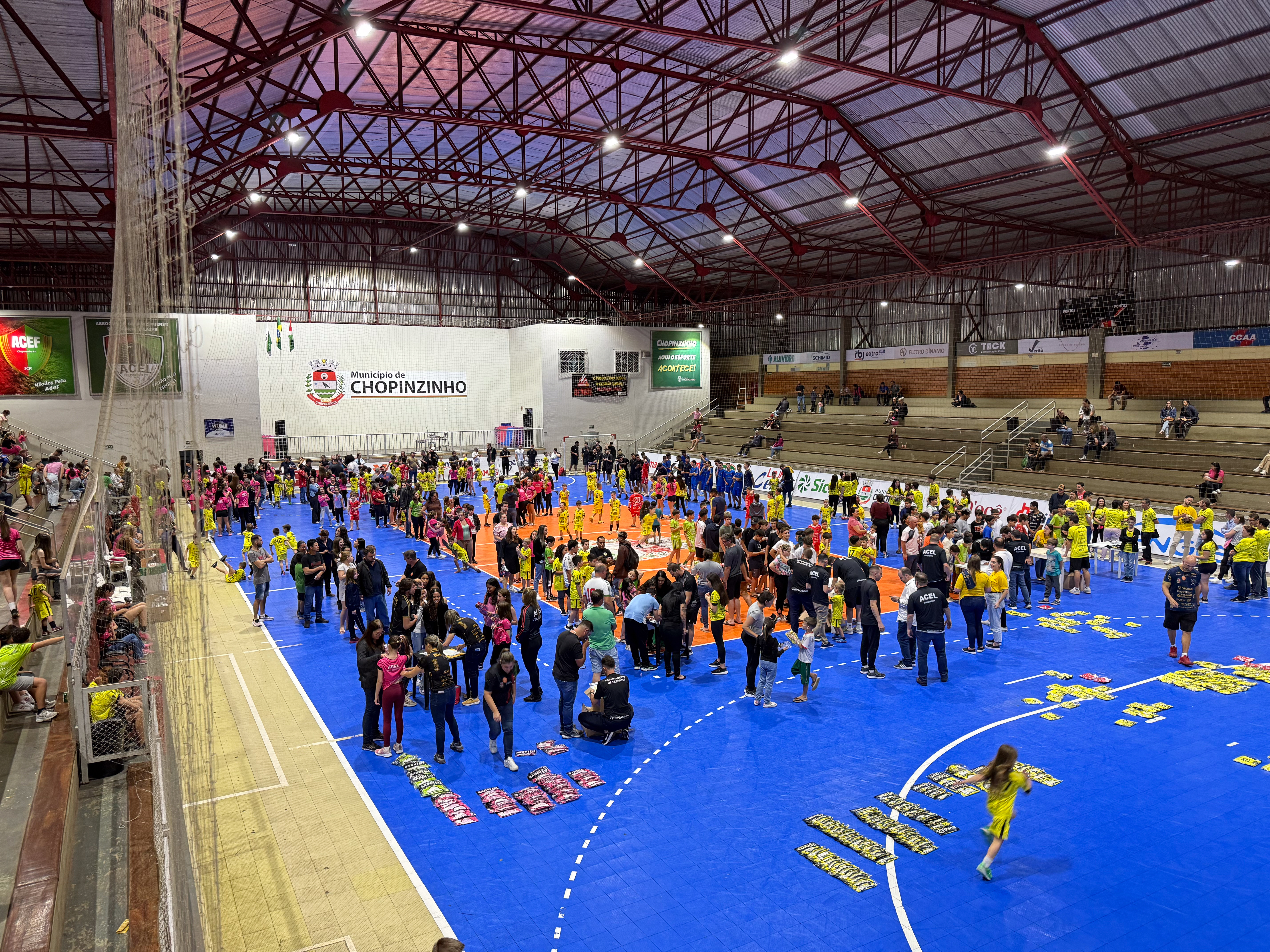 A quarta-feira foi marcada por um momento especial no Ginásio Deonisto Debona: a entrega oficial dos uniformes para os alunos das escolinhas esportivas de Chopinzinho. Em parceria com a Administração Municipal, a ACEL realizou a distribuição de kits completos para as crianças e adolescentes que integram as modalidades de base — futsal, voleibol, badminton e taekwondo.